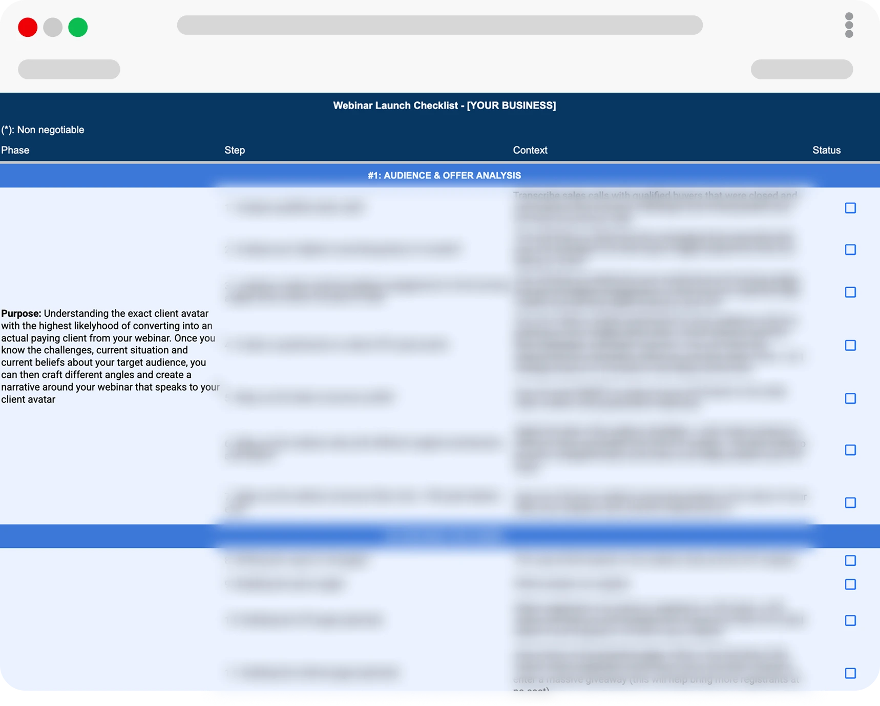 You’ll never have to guess what step comes next… or wonder if you missed something that could tank your webinar funnel. This 28-step checklist walks you through every step of the webinar launch process - from building the hype, to email marketing, to copy, to tech setup. It’s the same internal checklist I use with all of our partners before launching webinars.