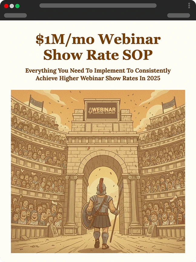 You'll get access to our internal webinar show rate SOP that uses 7 different strategies and incentives to increase any webinar show rate - from the initial registration email, to the email sequences, to paid ads to setters and setting a private group.